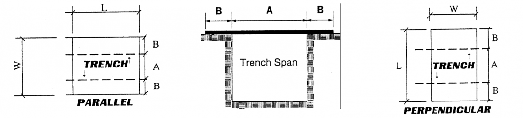 Trench widths are based on an analysis per the 14th edition of the “standard specification for highway bridges” by A.A.S.H.T.O.  An assumed axle loading of 12 tons with a 30% impact factor was used.  The axle length is 6 feet; therefore the number of wheels carried by a plate depends on the roadway width.